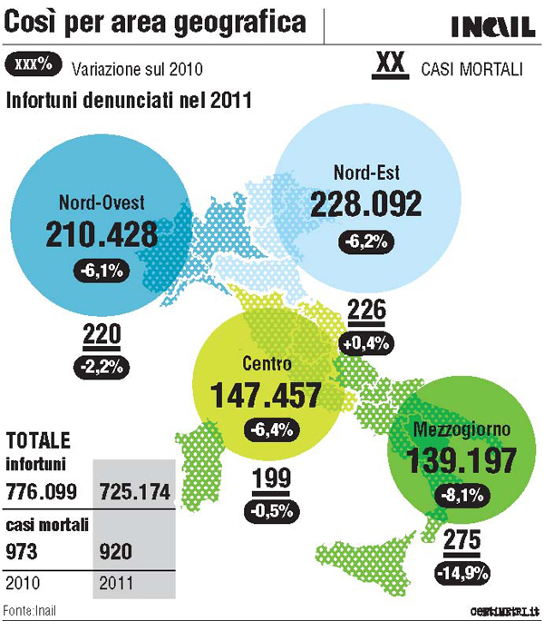 Anche se i valori sono ancora alti è bene sottolineare che questi sono in costante calo da alcuni anni. Analizzando alcune infografiche pubblicate sul sito dell’INAIL si scopre che il maggior numero di infortuni registrati nel 2011 sono avvenuti nel nord est Italia (228.092) e nel nord ovest (210.428). Il centro Italia e il meridione si attestano rispettivamente con 147.457 e 139.197 denunce di infortunio sul lavoro.