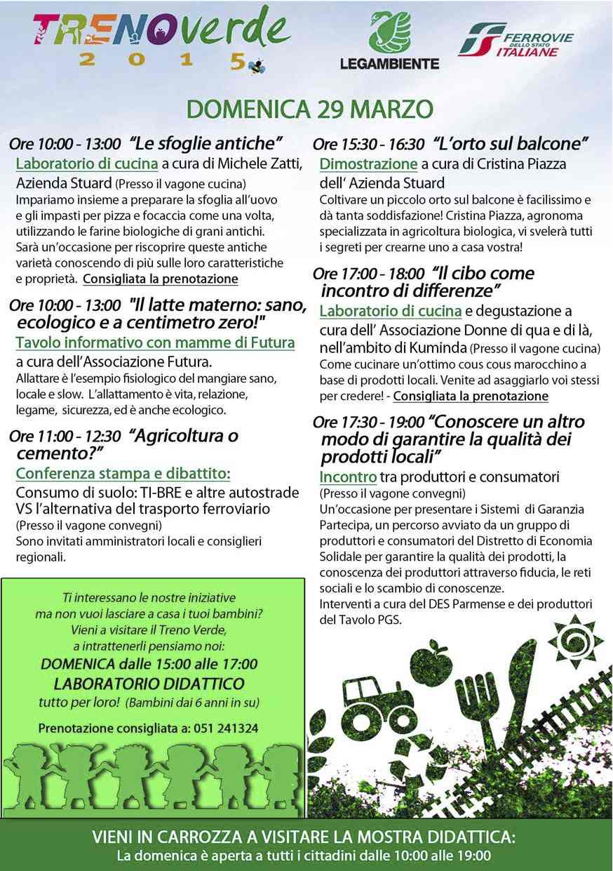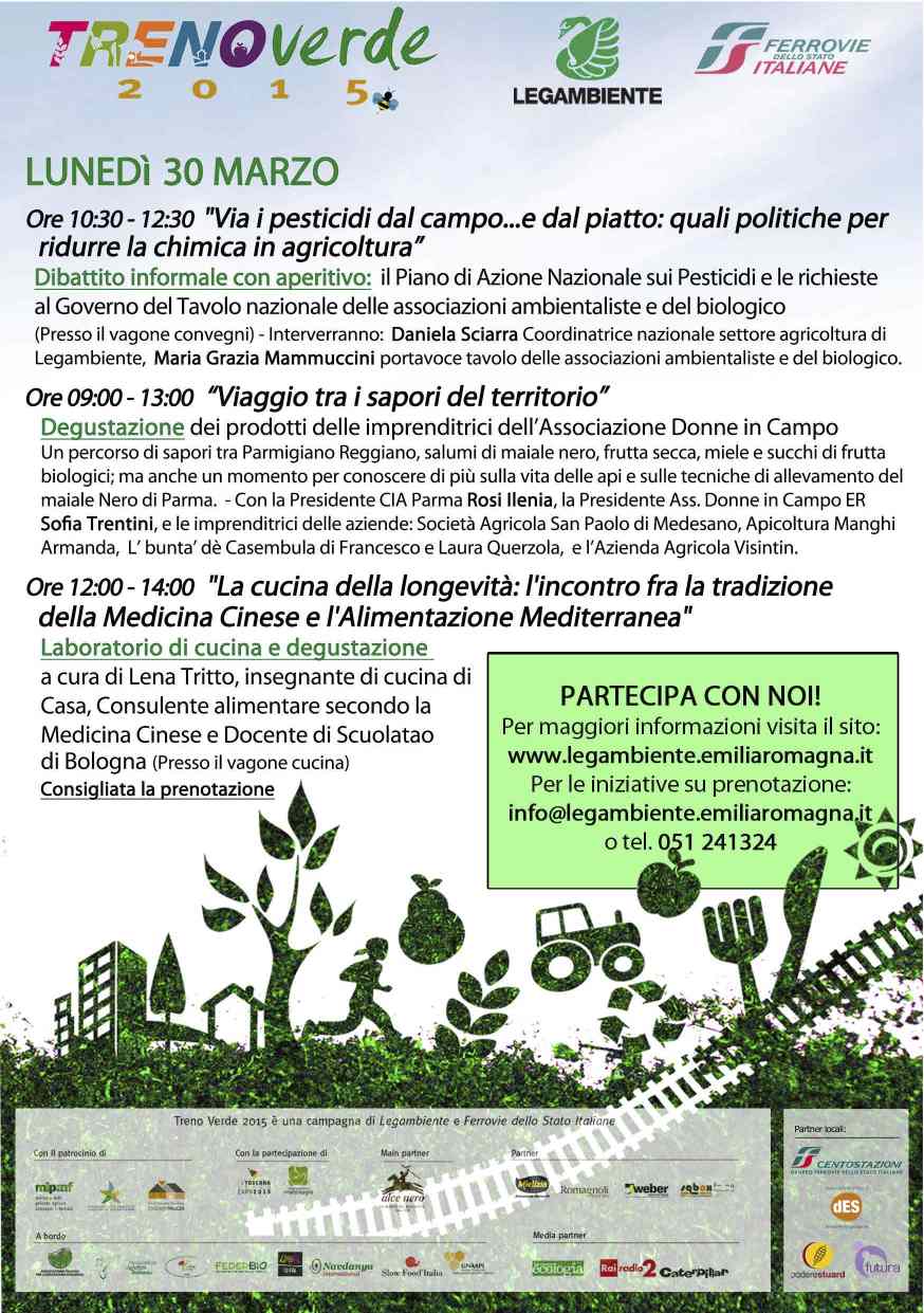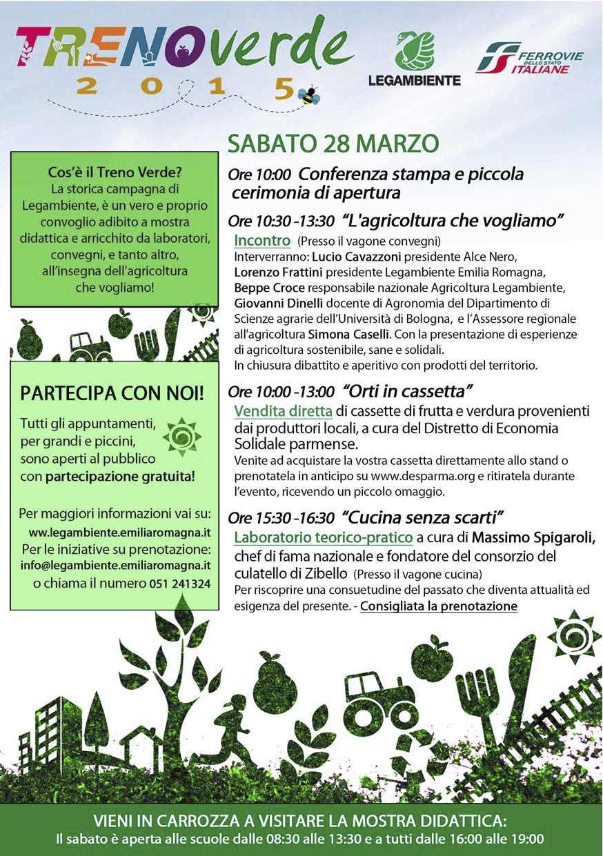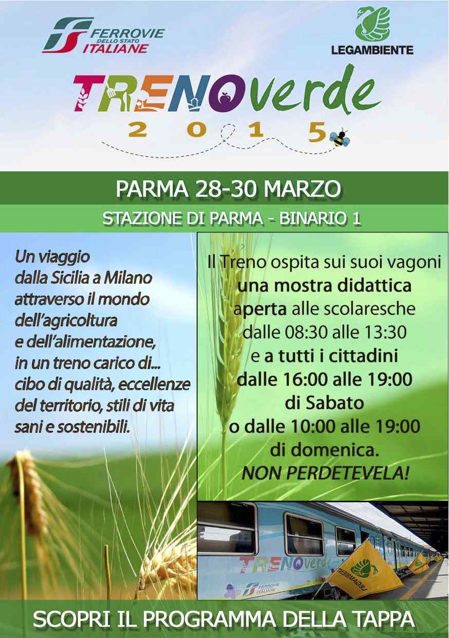 Dal 28 al 30 marzo 2015, il Treno Verde farà la sua dodicesima tappa a Parma. Partito il 18 febbraio, concluderà il suo viaggio il 10 aprile a Milano, dopo aver attraversato tutta la Penisola ed essersi fermato in 15 stazioni.