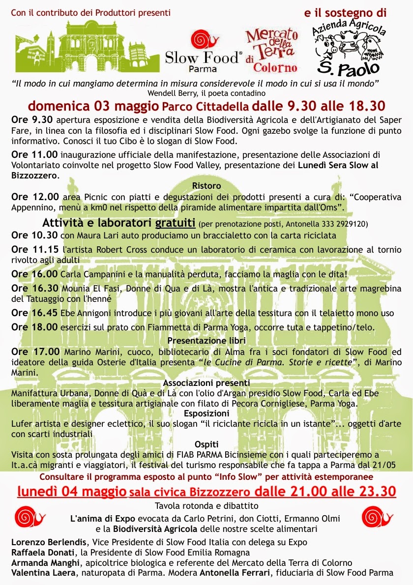 A seguire, lunedì 4 maggio alle ore 21 presso la Sala Civica del Podere Bizzozzero, si terrà una tavola rotonda dal tema: “l’anima di Expo” evocata da Ermanno Olmi, don Luigi Ciotti e Carlo Petrini e “la Biodiversità agricola” delle nostre scelte alimentari, con Lorenzo Berlendis Vice Presidente di Slow Food Italia con delega su Expo, Raffaela Donati Presidente di Slow Food Emilia Romagna, Armanda Manghi apicoltrice biologica rappresentante dei produttori del Mercato della Terra di Colorno e Valentina Laera naturopata, modera Antonella Ferrari fiduciaria di Slow Food Parma.