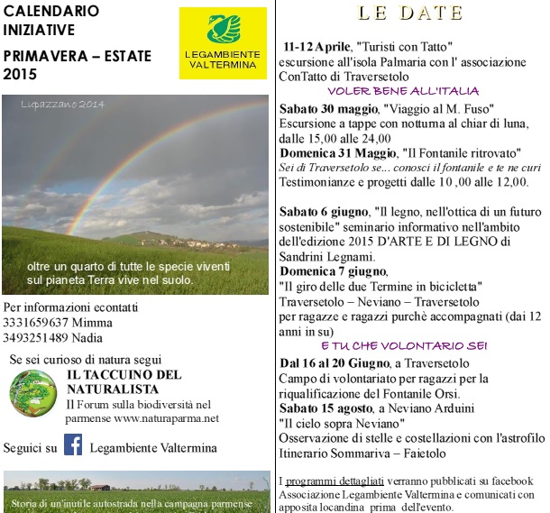I programmi dettagliati verranno pubblicati su facebook Associazione Legambiente Valtermina e comunicati con apposita locandina prima dell’evento.