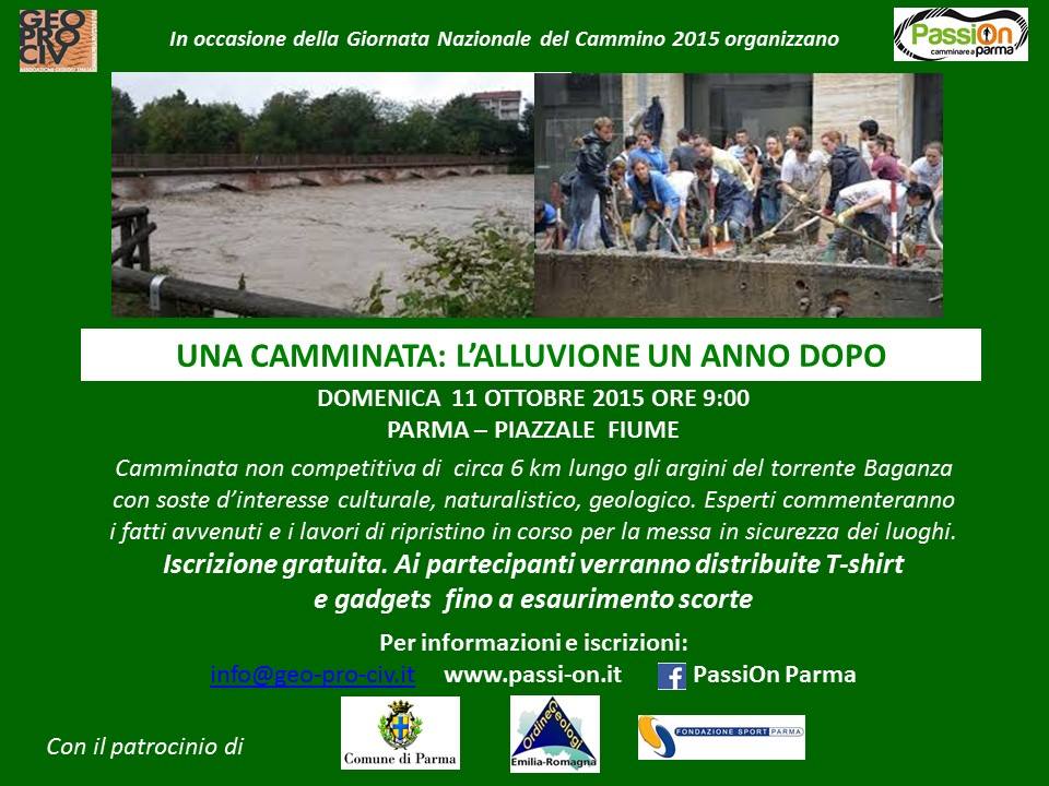 Domenica 11 ottobre ricorre la Giornata del cammino 2015 e a Parma l’associazione PassiOn, in collaborazione con Geo Pro Civ, ha organizzato una camminata non competitiva di 6 KM lungo gli argini del torrente Baganza per ricordare l’alluvione che ha devastato il nostro territorio esattamente un anno fa.
