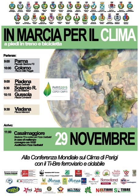 Segnaliamo infine che nella provincia di Parma ci sarà la manifestazione “In bici per il clima”, alla quale aderiscono tutti i sindaci interessati alla Ti-bre ferroviaria-ciclabile dei territori cremonese e parmense (Parma compreso) e varie associazioni come Legambiente e Wwf e FIAB PARMA Bicinsieme. Ci saranno anche Fiab Cremona e Mantova.
