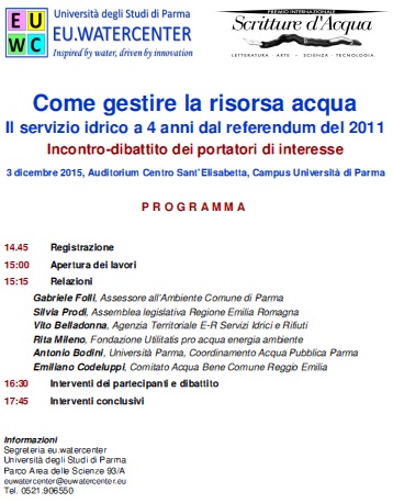 Giovedì 3 dicembre si terrà presso l’Università degli Studi di Parma l’incontro-dibattito dal titolo “Come gestire la risorsa acqua, il servizio idrico a 4 anni dal referendum del 2011“.