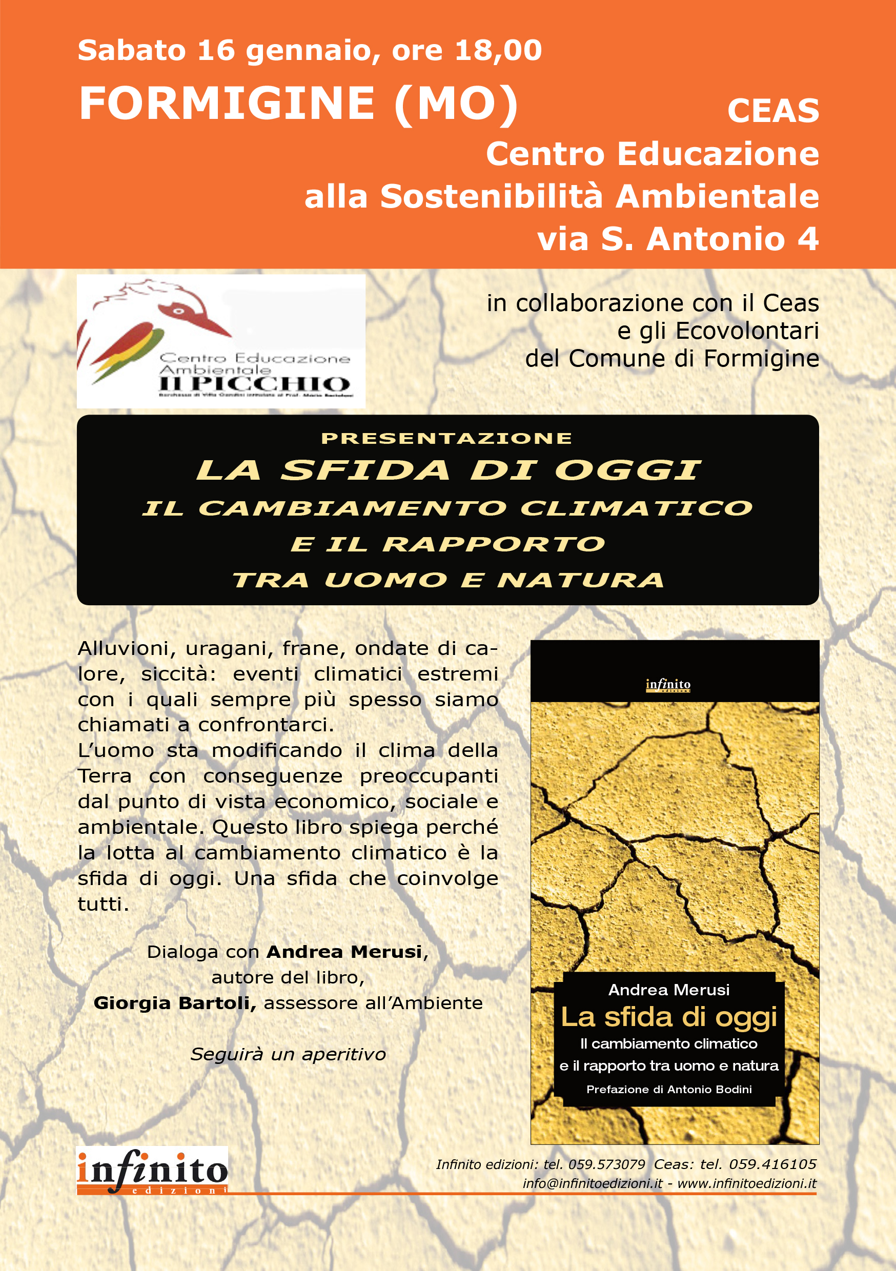 Il cambiamento climatico è strettamente legato al fattore umano in un rapporto di stretta interdipendenza che viene affrontato nel testo di Andrea Merusi dal titolo La sfida di oggi. Il cambiamento climatico e il rapporto tra uomo e natura, che sarà presentato sabato 16 gennaio alle 18,00 a Formigine (Mo), presso il Ceas, il Centro Educazione alla Sostenibilità Ambientale (via S. Antonio 4). Dialoga con l’autore l’assessore all’Ambiente Giorgia Bartoli.