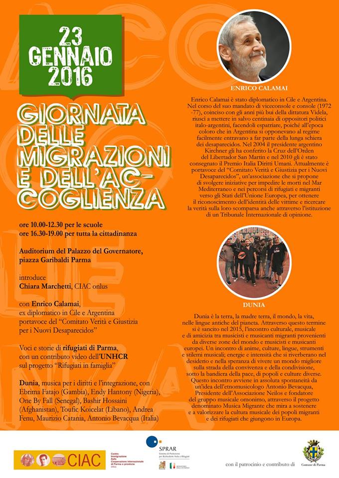 Sabato 23 gennaio 2016, alle ore 10.00 – 12.30 per le scuole e alle ore 16.30 – 19.00 con un evento aperto a tutta la cittadinanza, l’associazione CIAC onlus, con il patrocinio e il contributo del Comune di Parma, promuove la Giornata delle migrazioni e dell’accoglienza, presso l’Auditorium del Palazzo del Governatore, in piazza Garibaldi a Parma.