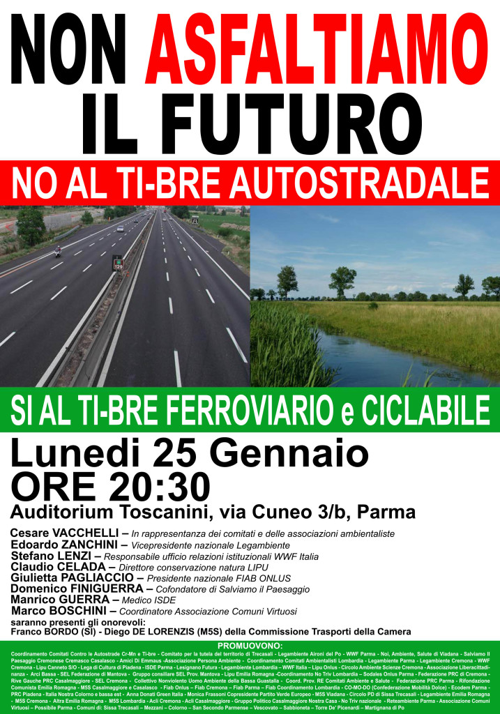 Il 25 gennaio alle 20.30, presso l’auditorium Toscanini di via Cuneo a Parma, si terrà l’incontro pubblico “Non asfaltiamo il futuro. No al Tibre autostradale, sì al Tibre ferroviario e ciclabile”, a cui parteciperanno i vertici nazionali di alcune associazioni ambientaliste, istituzioni ed esponenti del mondo della politica.