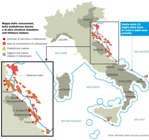 Quindi, semplificando, non si tratta di un referendum contro la costruzione di nuove trivelle, in quanto tale costruzione è già vietata, ma serve per decidere se prolungare o meno le concessioni per l’estrazione di gas metano e petrolio per gli impianti già attivi e situati entro le 12 miglia (22,2 km) delle coste dei mari italiani.