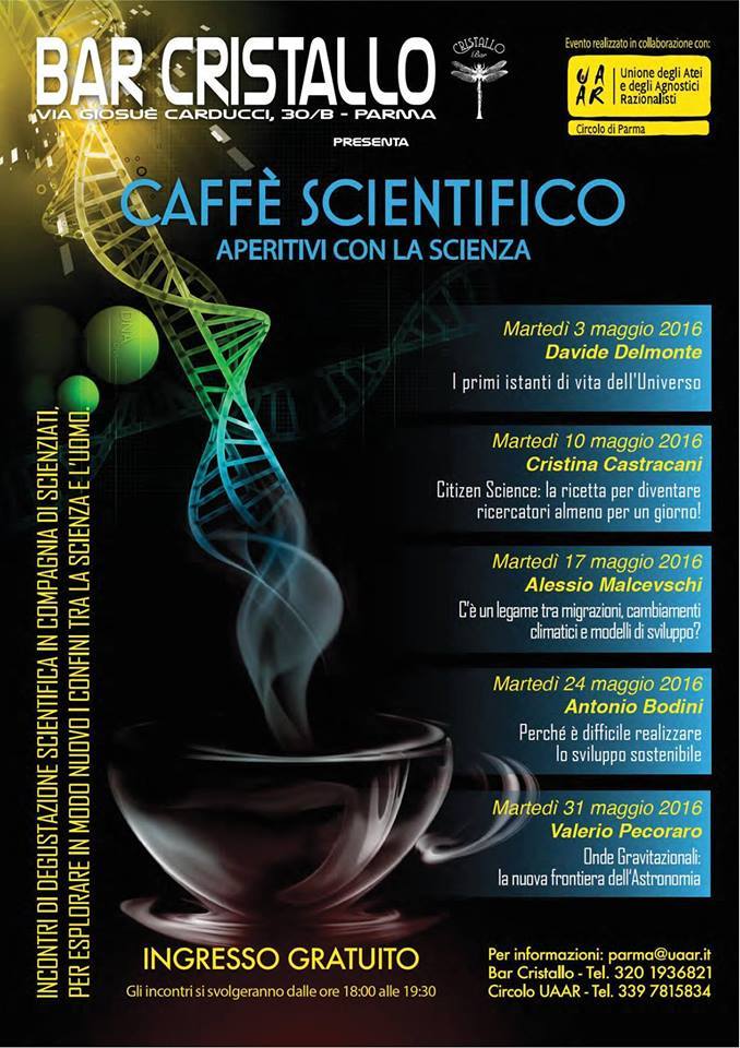 L’incontro, che fa parte della rassegna “Caffè scientifico – Aperitivi con la scienza” organizzata dall’Unione degli Atei e degli Agnostici Reazionalisti di Parma, si terrà dalle ore 18 alle ore 19.30 al Bar Cristallo di via Carducci 30/B, Parma.