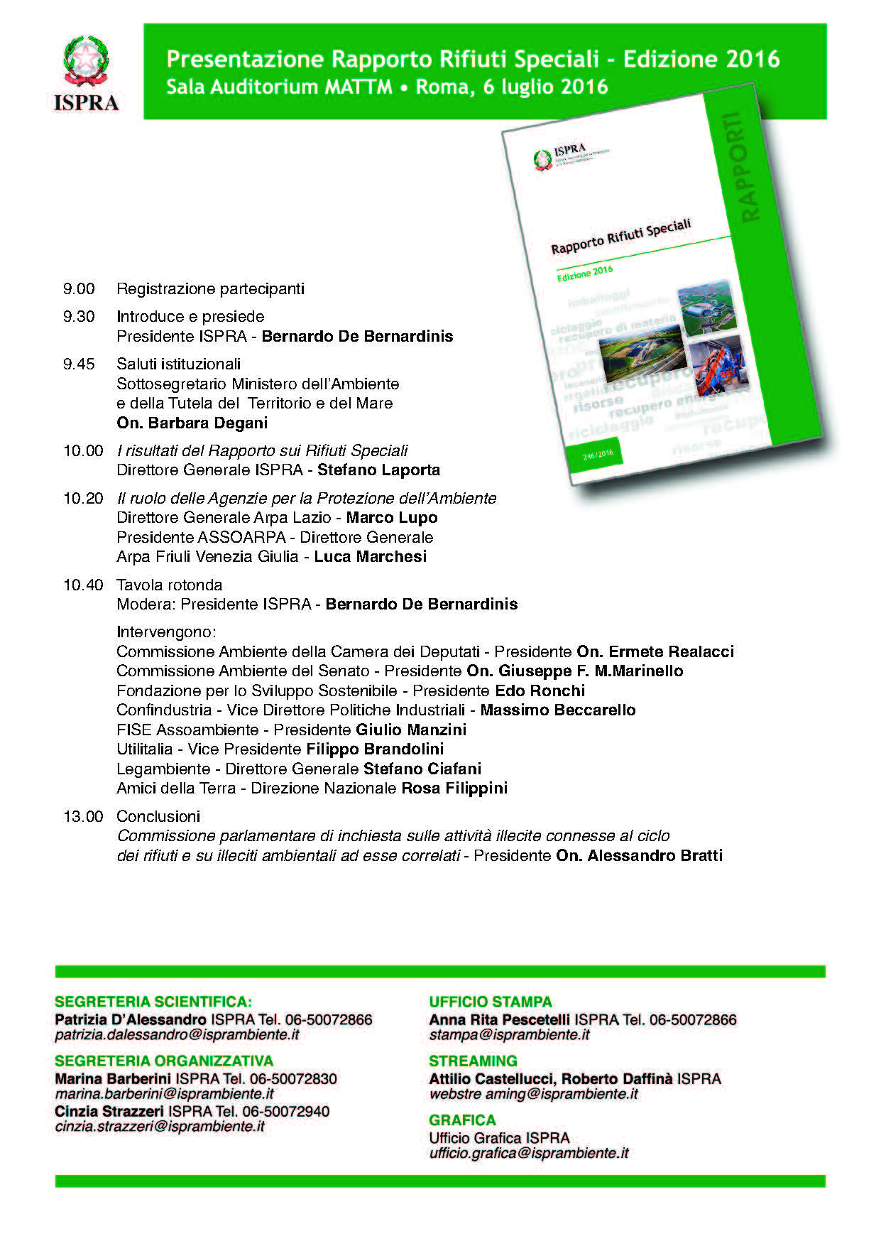 Mercoledì 6 luglio si terrà a Roma, presso la l’auditorium del Ministero dell’Ambiente, la presentazione dell’ultima edizione del rapporto sui rifiuti speciali.