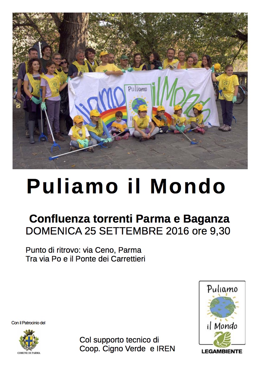 Il prossimo weekend si terrà in tutta Italia l’edizione 2016 dell’iniziativa “Puliamo il Mondo”. A Parma l’appuntamento è programmato per domenica 25 settembre con ritrovo alle ore 9.30 in via Ceno presso l’ex-pizzeria Fontana (accesso da via Po, angolo ponte dei Carrettieri).