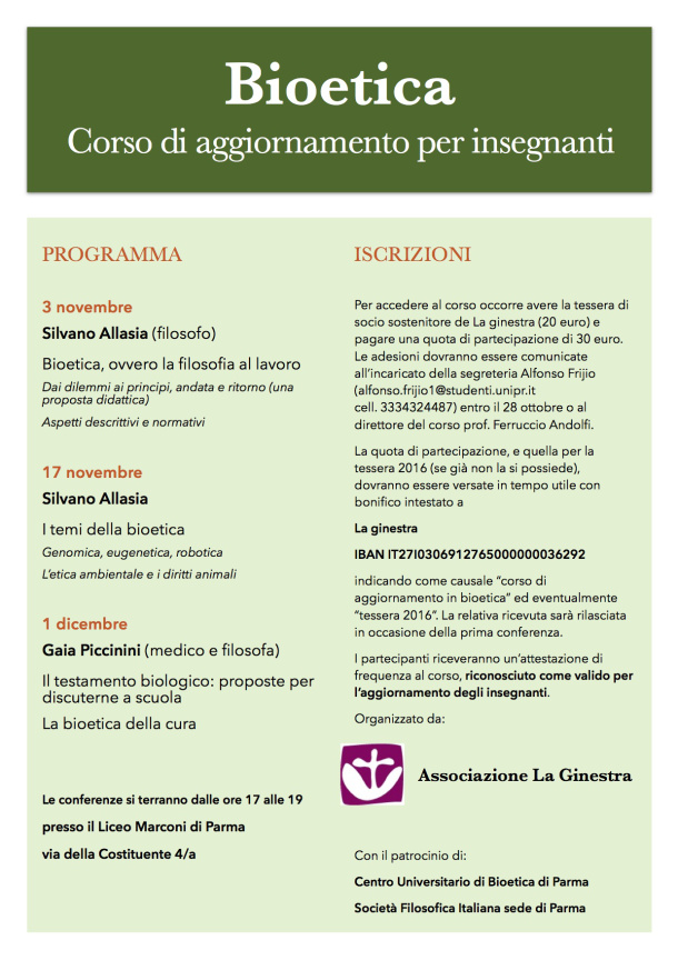 L’associazione La Ginestra, con il patrocinio del Centro Universitario di Bioetica di Parma e della Società Filosofica Italiana organizza un corso di aggiornamento professionale in Bioetica per insegnanti e per altri laureati di discipline sia umanistiche che scientifiche.