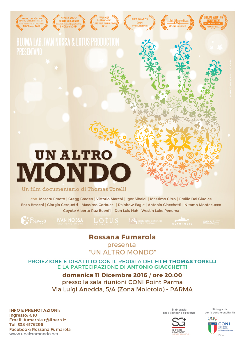 Domenica 11 dicembre alle ore 20.00, presso la Sala CONI Parma (via Luigi Anedda 5/a – zona Moletolo) si terrà la proiezione del documentario “Un Altro Mondo“. Sarà presente l’autore e regista Thomas Torelli e dopo la proiezione si terrà un dibattito sui temi trattati nel documentario.