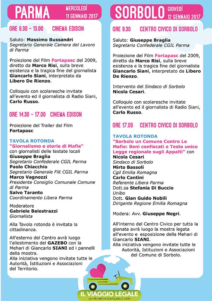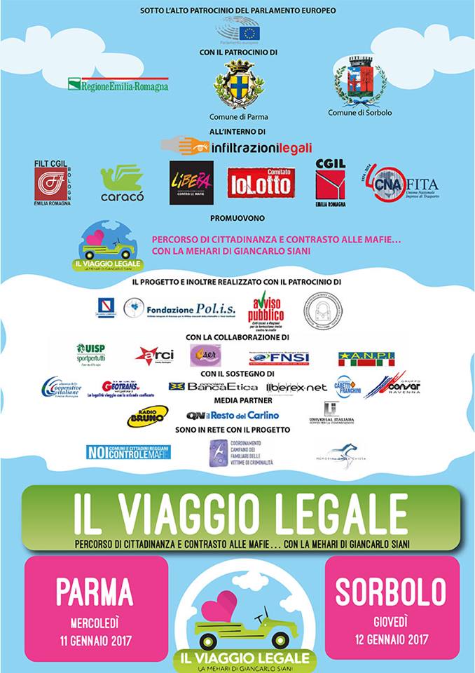 Mercoledì 11 gennaio inizierà il “viaggio legale” organizzato dall’associazione Libera Parma, un viaggio che si concluderà a Sorbolo il giorno seguente. Si tratta di un percorso di cittadinanza per riflettere sui mille aspetti della legalità e promuovere occasioni di confronto e attività culturali, di formazione e informazione. L’iniziativa nasce per ricordare Giacarlo Siani, il giornalista napoletano brutalmente ucciso sull’auto Mehari nel 1985 per mano della camorra.