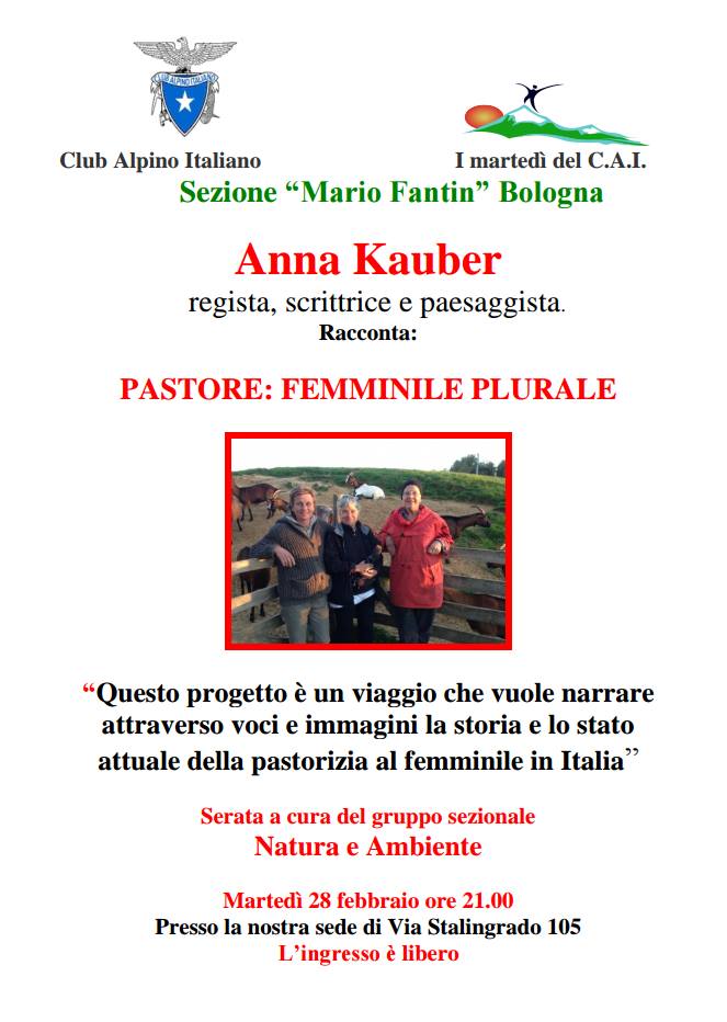 Il CAI di Bologna – sezione “Mario Fantin” – ha organizzato per martedì 28 febbraio un incontro con la regista e paesaggista Anna Kauber che parlerà del progetto “Pastore: femminile, plurale“.