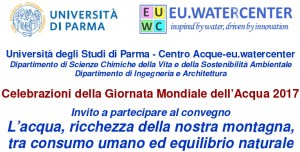 Mercoledì 22 marzo 2017 alle ore 9.30, nella Sala Congressi Q02 del Campus Scienze e tecnologie dell’Università di Parma (Parco Area delle Scienze), in occasione delle celebrazioni della Giornata Mondiale dell’Acqua 2017 si terrà il convegno “L’acqua, la ricchezza della nostra montagna, tra consumo umano ed equilibrio naturale”, organizzato dal Centro Acque – eu.watercenter dell’Università con il Dipartimento di Scienze Chimiche, della Vita e della Sostenibilità Ambientale e il Dipartimento di Ingegneria e Architettura.
