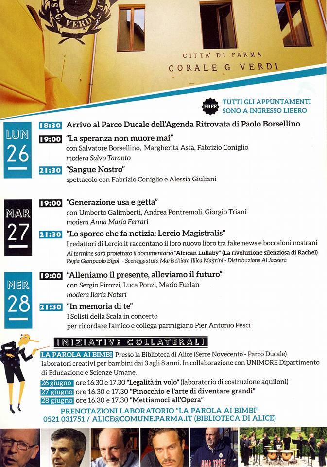 Per la prima volta al Festival della Parola di Parma, ci sarà un’anteprima per i più piccoli, denominata “La Parola ai bimbi”: nei tre giorni del festival, presso la Biblioteca di Alice, sempre al Parco Ducale, in due turni, alle 16:30 e alle 17:30, bambini dai 3 agli 8 anni potranno essere conquistati dall’estro e dalla fantasia di attori di teatro di animazione, legato al dipartimento di educazione e scienze umane di UNIMORE (Università di Modena e Reggio Emilia). Il 26 giugno i bimbi che avranno la curiosità di partecipare al laboratorio, potranno costruire degli aquiloni dove verranno scritte delle parole. E saranno gli aquiloni creati nel corso dell’incontro a salutare l’arrivo dell’agenda ritrovata di Paolo Borsellino al parco Ducale. Nei giorni successivi con i bimbi saranno toccati i temi di Pinocchio e della bugia (27 giugno) e della musica e delle varie arti (28 giugno). Tornando ai più grandi, TESTIMONIANZA, SPERANZA, ATTENZIONE, GIOVANI, FUTURO, MEMORIA saranno le parole chiave attorno a cui i vari protagonisti del Festival daranno vita a incontri colloquiali, spettacoli, proiezioni, concerti.