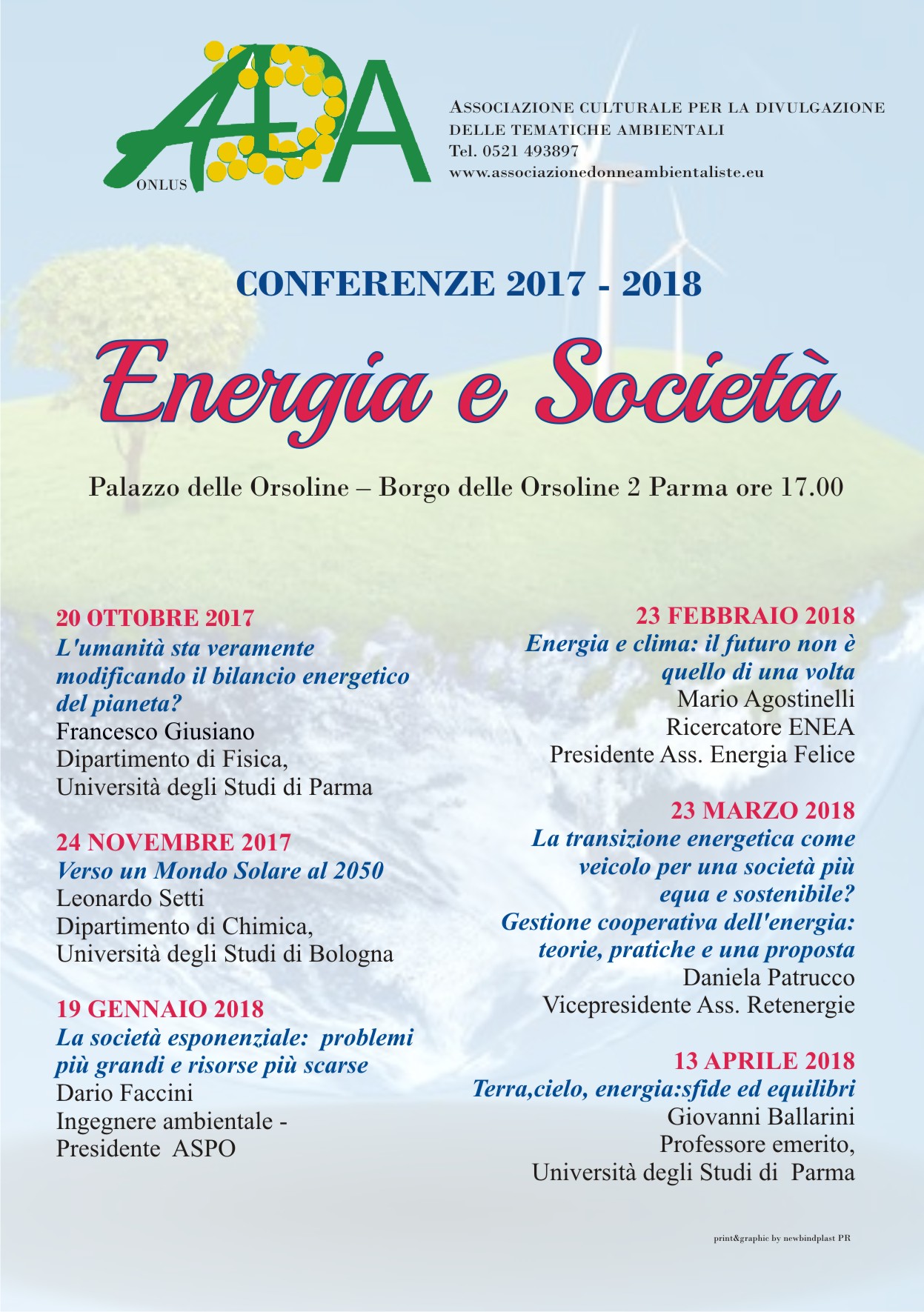L’associazione Donne Ambientaliste ADA onlus, che da anni arricchisce il panorama culturale di Parma, annuncia l’avvio di un nuovo ciclo di conferenze dal titolo “Energia e Società“.