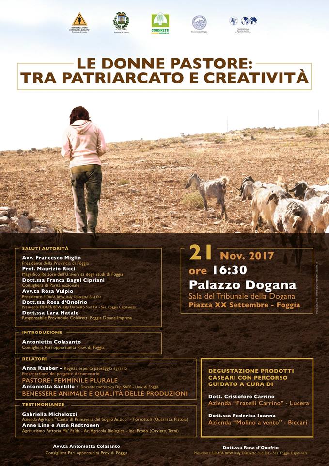 L’anno scorso fui invitata dall’Università di Foggia, che volle portare il mio lungo viaggio pastorale agli studenti della Facoltà di Agraria. Come sempre, chiesi che fosse data la parola anche ad almeno una delle mie pastore. Scelsi Maria, magnifica pastora del Pollino: ma che fatica a convincerla! Maria fu immediatamente amata (cosa di cui ero certa!) e pure il Rettore si complimentò con lei, che felicità! Presente in quell’occasione c’era Antonietta Colasanto, Consigliera Pari Opportunità della prov. di Foggia, la quale recepì immediamente di quale forza, coraggio, autonomia e perseveranza le donne pastore sono portatrici. Senza autocelebrazione, ma sempre inclusive e solidali; mai assertive, e anzi fortemente autoironiche; in modo semplice – ma diretto ed efficace – e anzi, con frequenti note di dolcezza e spirito giocoso, il loro linguaggio e le loro scelte dimostrano quella peculiare qualità femminile che si esprime pienamente nella cura degli animali (compresi quelli umani…) e della casa. Di quella COMUNE, intendo, oltre che della propria (in questo caso, in subordine!). Antonietta mi disse che la loro testimonianza era da valorizzare, da comunicare ancora. Ed ecco quello che ha pensato. Un bellissimo e ricco incontro di riflessione sul pensiero creativo delle donne, così presente e rivoluzionario anche nel mondo della pastorizia, come esemplare paradigma di specificità di genere.