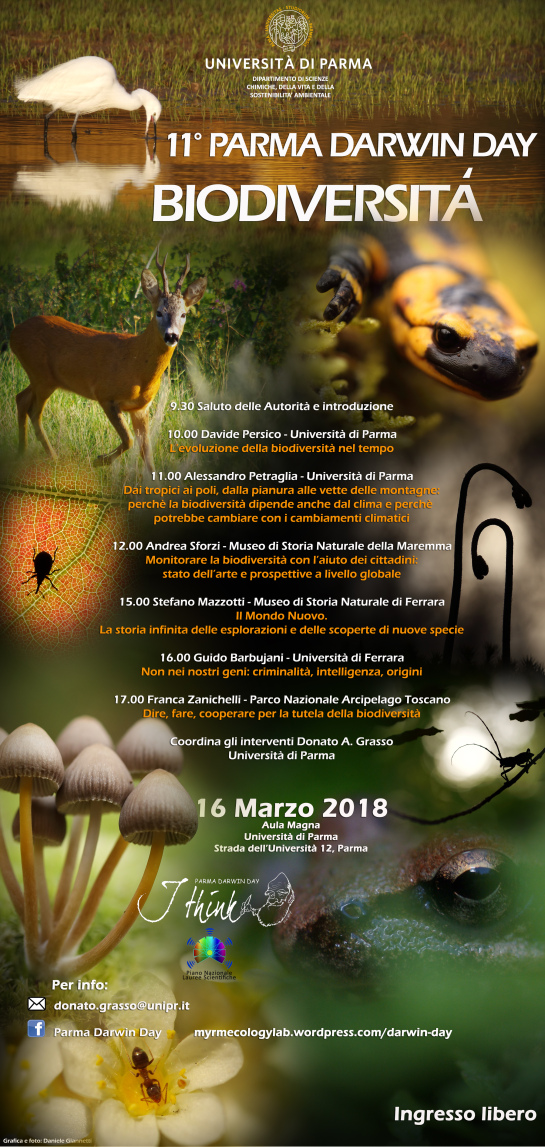 Ritorna venerdì 16 Marzo 2018, a partire dalle ore 9.30, nell’Aula Magna del Palazzo Centrale dell’Ateneo (via Università 12), l’appuntamento annuale con il “Parma Darwin Day”, promosso e organizzato dal Dipartimento di Scienze Chimiche, della Vita e della Sostenibilità Ambientale dell’Università di Parma per celebrare la figura di Charles Darwin e come importante occasione di informazione e confronto culturale rivolta non solo agli esperti del settore, ma a chiunque sia interessato a questo genere di tematiche.