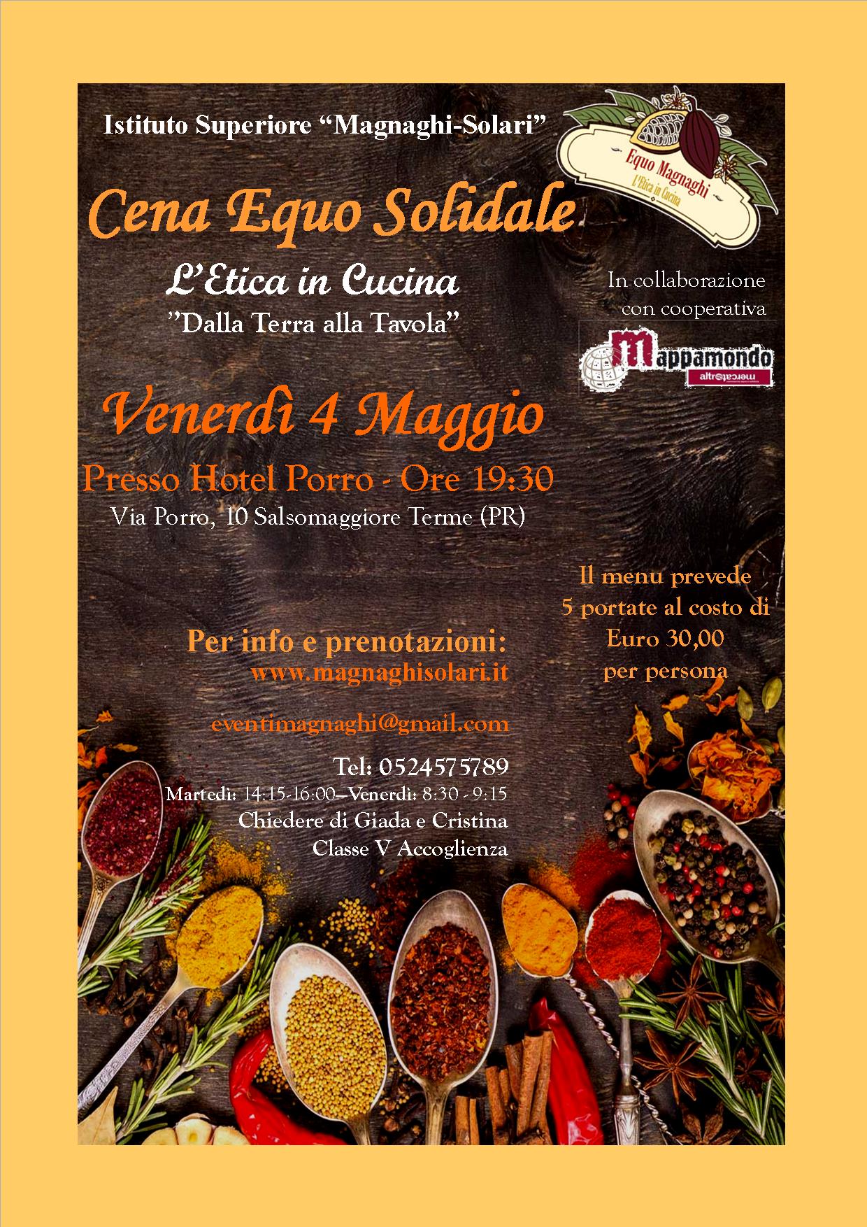 L’Istituto Superiore Magnaghi-Solari in collaborazione con la Cooperativa Mappamondo ha organizzato per venerdì 4 maggio una cena solidale dal titolo “l’Etica in cucina. Dalla terra alla tavola”.