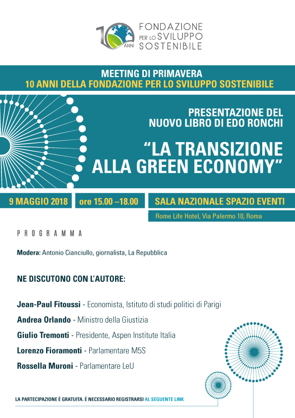 Il Meeting per i 10 anni della Fondazione per lo sviluppo sostenibile si svolgerà il prossimo 9 maggio a Roma, dalle 15.00 alle 18.00, presso il Nazionale Spazio Eventi del Rome Life Hotel in Via Palermo, 10.