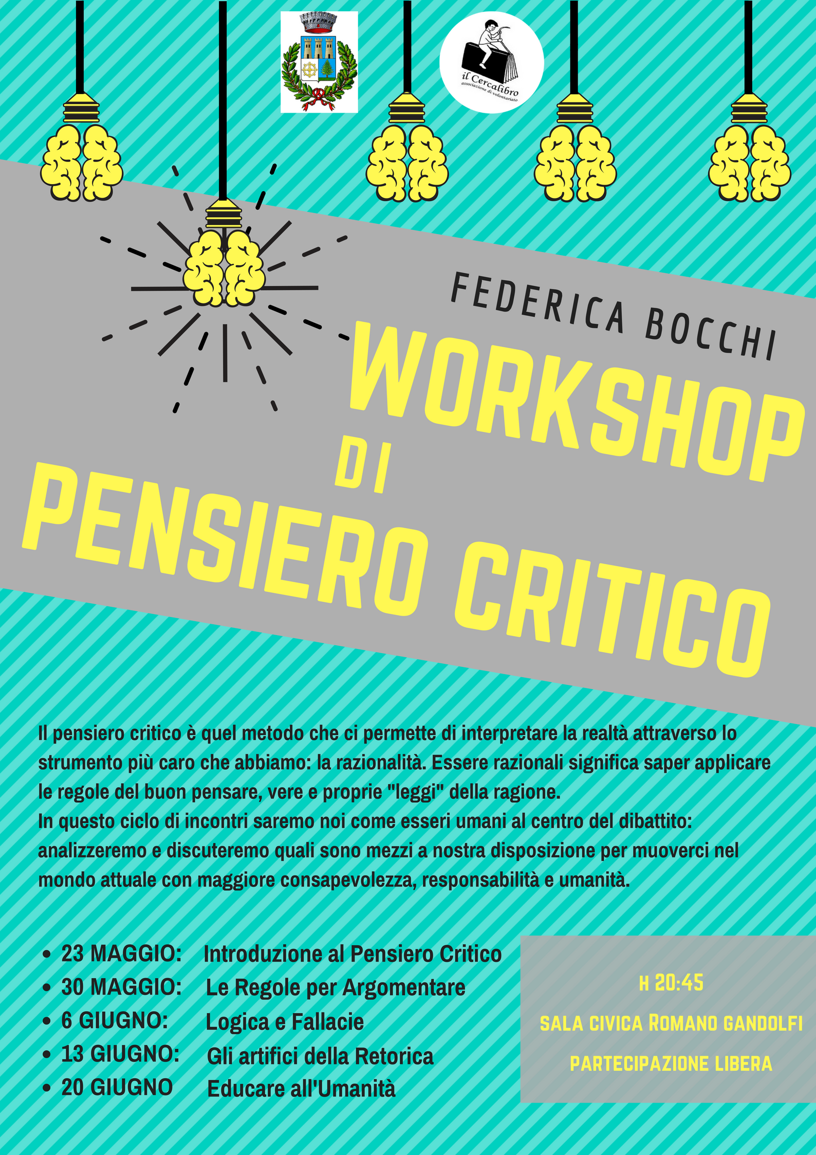 Workshop di Pensiero Critico: 5 incontri dedicati al “pensare bene”, curati dalla filosofa Dott.ssa Federica Bocchi che presenterà alcune tecniche filosofiche per argomentare e non farsi ingannare dagli artifici retorici (ma nemmeno dai propri pregiudizi). Ampio spazio sarà dedicato alla discussione, in particolare di temi politically S-correct!