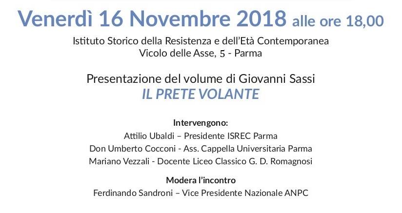 Oltre all’autore saranno presenti Attilio Ubaldi (presidente ISREC Parma), Don Umberto Cocconi (Ass. Cappella Universitaria Parma), Mariano Vezzali (Docente Liceo Classico G.D. Romagnosi) e Ferdinando Sandroni (Vice Presidente Nazionale ANPC).