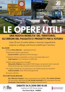 Sabato 24 novembre alle ore 10 presso l’ Auditorium APE Parma Museo (via Farini 32/A, Parma) si terrà il seminario “Le opere utili” organizzato da Legambiente, per proporre un dialogo sulla buona mobilità per il territorio parmense, dopo 20 anni di scelte dubbie o mancate.