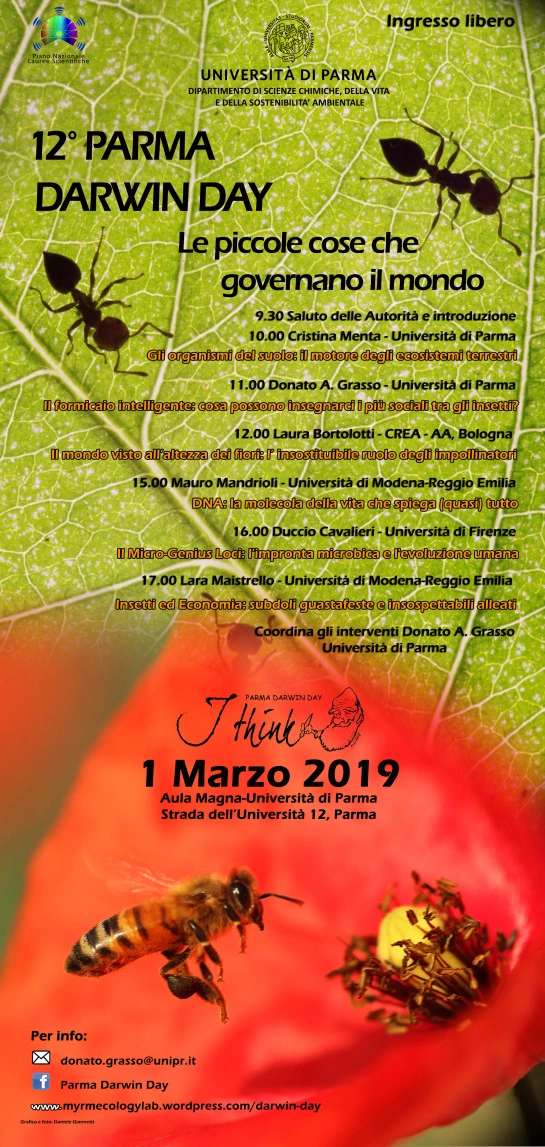 https://myrmecologylab.wordpress.com/darwin-day/darwin-day-2019/ o pagina Facebook Parma Darwin Day (https://www.facebook.com/Parma-Darwin-Day-543016175719501/)