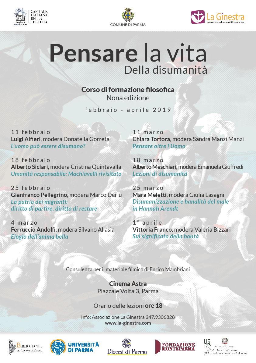 L’iniziativa è promossa dall’Associazione culturale La Ginestra con il sostegno dell’Assessorato alla Cultura del Comune di Parma con il patrocinio di numerosi enti locali e regionali, tra cui il Dipartimento di Discipline Umanistiche, Sociali e delle Imprese Culturali dell’Università di Parma. Il programma prevede otto lezioni (ogni lunedì alle ore 18, presso il cinema Astra, in Piazzale Volta, 3) tenute da filosofi ed esperti di scienze umane e naturali, aperte a tutti. La loro frequenza non richiede competenze specialistiche preliminari.