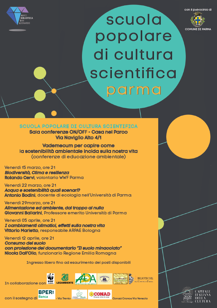 L’iniziativa, patrocinata dal Comune di Parma, è svolta in collaborazione con WWF Parma, Legambiente, ADA onlus, Università Popolare di Parma, Fratelli Bormioli Rocco, Biblioteche Comune Parma, con il sostegno di BPER Banca via Trento, Cigno Verde, Conad Cronos via Venezia.
