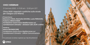 Martedì 21 gennaio, dalle ore 11 alle 12, si terrà un nuovo webinar del Centro Euro-Mediterraneo sui Cambiamenti Climatici dal titolo: “Clima 2020: Negoziati e Politiche sulla strada per Glasgow (via Milano)”.
