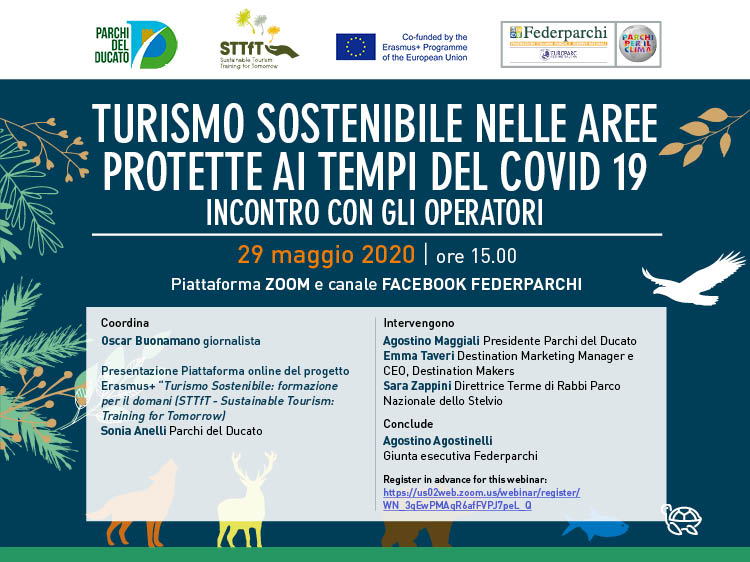 Favorire il turismo sostenibile nelle Aree Protette garantendo fruibilità e sicurezza sanitaria dopo l’emergenza da Covid19. Tenere presente il ruolo della formazione dei gestori e degli operatori delle nelle aree naturali protette. E’ questo lo scopo dell’incontro digitale via Zoom di venerdì 29 maggio, alle ore 15, che sarà trasmesso anche in diretta Facebook sulla pagina Federparchi.Il confronto si svolge nell’ambito della collaborazione con il progetto “Turismo Sostenibile: formazione per il domani” (STTfT – Sustainable Tourism Training for Tomorrow) promosso dai Parchi del Ducato e inserito nel contesto europeo di Erasmus+.
