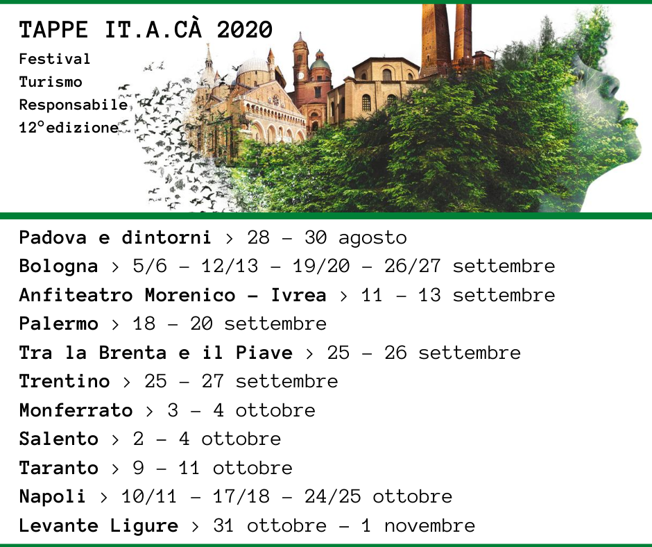 Dal 28 agosto al 1 novembre la rete di IT.A.CÀ propone quindi una serie di eventi (cammini, trekking urbani, itinerari in bicicletta, escursioni in canoa, presentazioni libri, laboratori, mostre, mini tour ecc.) sempre nel rispetto delle norme sanitarie nazionali vigenti.
