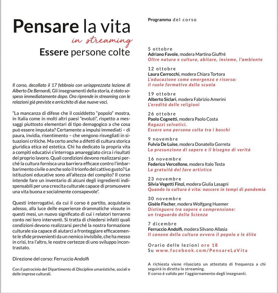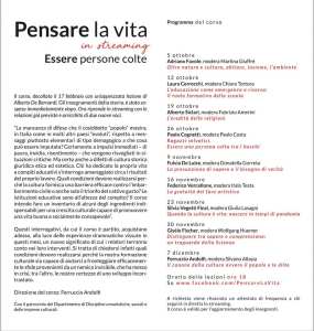 Le lezioni saranno online alle 18, in forma dialogica, sulla pagina fb http://www.facebook.com/PensareLaVita