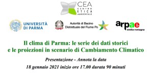 Lunedì 18 gennaio, ore 17.00, si terrà il primo seminario web pubblico di un programma di informazione e documentazione della cittadinanza inserito all’interno di un progetto collaborativo, tra CEA, AeroDron Parma, ARPAE IdroMeteoClima, Autorità di Bacino Distrettuale Fiume Po e Università di Parma, su indicatori, impatti e soluzioni di adattamento al cambiamento climatico applicati al tessuto urbano di Parma.