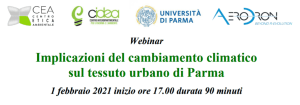 Il 1° febbraio 2021 con inizio alle ore 17.00 si terrà il secondo seminario web pubblico di informazione e documentazione inserito in un progetto collaborativo, tra Centro Etica Ambientale di Parma (CEA), Università di Parma, CIdEA, AeroDron Parma, ARPAE IdroMeteoClima e Autorità di Bacino Distrettuale fiume Po su indicatori, impatti e soluzioni di adattamento al Cambiamento Climatico applicati al territorio di Parma.