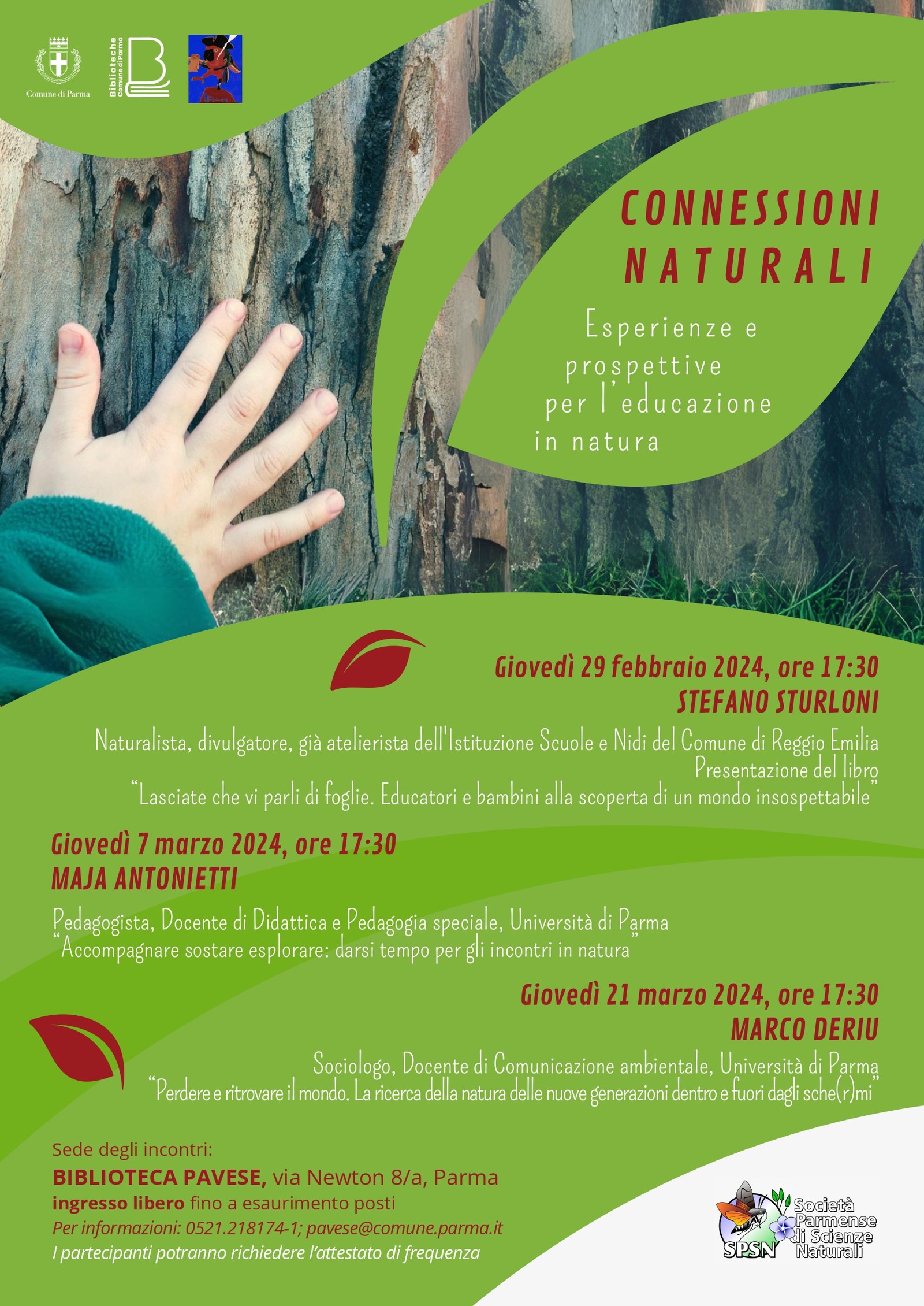 L’appuntamento, a ingresso libero, rientra nell’ambito della rassegna “Connessioni naturali. Esperienze e prospettive per l’educazione in natura”, promossa dalla biblioteca Cesare Pavese e dalla Società Parmense di Scienze Naturali, con la supervisione scientifica di Franca Zanichelli.
