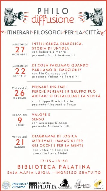Per l’anno 2024-25 l’Università di Parma (Unità di Filosofia del Dipartimento di Discipline Umanistiche, Sociali e delle Imprese Culturali), in collaborazione con la Biblioteca Palatina, con l’associazione Amici della Pilotta, e con la Società Filosofia Italiana, propone una serie di incontri divulgativi dal titolo “Philo-diffusione” rivolti alla cittadinanza, su temi di filosofia contemporanea e storia della filosofia. La serie consisterà in 5 incontri, che si terranno tra novembre 2024 e maggio 2025, e ospiterà studiose e studiosi provenienti da varie Università europee, noti a livello nazionale e internazionale per il loro alto profilo di ricerca.