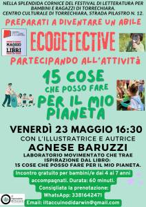 L’evento organizzato dalla nostra associazione è in programma venerdì 23 maggio, alle ore 16.30, con l’ospite Agnese Baruzzi, autrice e illustratrice di libri per l’infanzia. Agnese condurrà un laboratorio di educazione ambientale per bambine e bambini dai 4 ai 7 anni, e guiderà i partecipanti attraverso varie attività progettate per insegnare loro l’importanza del rispetto per l’ambiente in modo coinvolgente e stimolante.